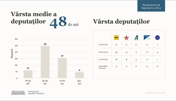 În noua legislatură sunt 12 deputați care au până la 35 de ani. 49 de deputați au vârsta între 36 și 50 de ani, iar alți 31 de parlamentari – între 51 și 62 de ani.