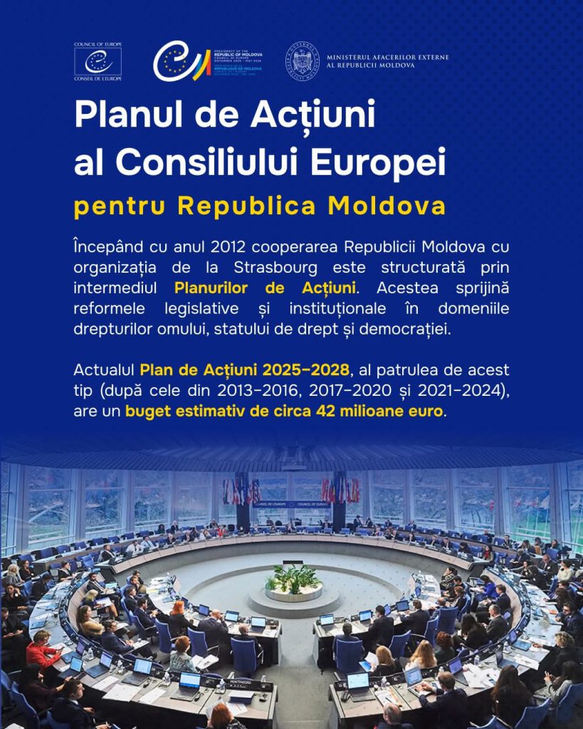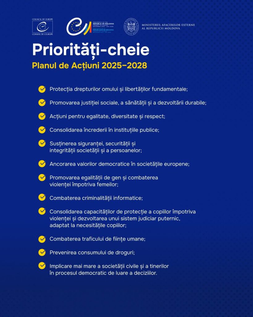 Pentru a explica pe scurt ce înseamnă acest rol, am pregătit o serie de carduri despre Consiliul Europei, Planul de Acțiuni pentru Republica Moldova 2025–2028, prioritățile-cheie și principalele instituții europene implicate.