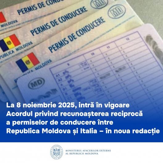 Ministerul Afacerilor Externe informează că, începând cu 8 noiembrie 2025, cetățenii Republicii Moldova care locuiesc în Italia vor putea preschimba și permisele de conducere emise după anul 2020 în permise italiene, fără a mai susține examene teoretice sau practice. De aceleași condiții vor beneficia și cetățenii italieni stabiliți în Republica Moldova.