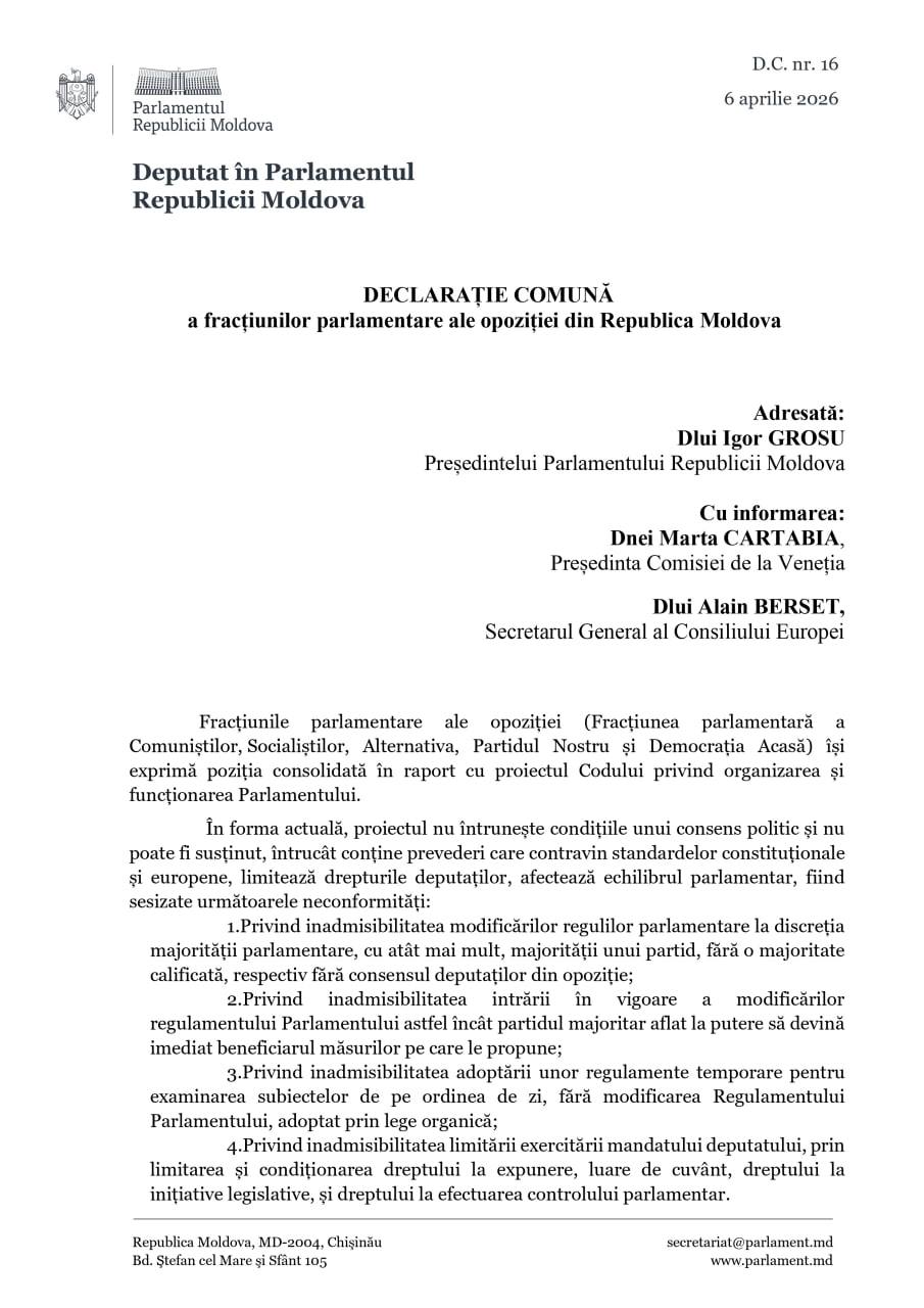 Astăzi, liderii fracțiunilor de opoziție din Parlamentul Republicii Moldova au transmis o adresare comună Secretarului General al Consiliului Europei, președintelui Comisiei de la Veneția și șefului Delegației Uniunii Europene în Republica Moldova, în legătură cu inițierea de către partidul de guvernare PAS a unor modificări ale cadrului legal care reglementează statutul și conduita deputatului, precum și legislația privind organizarea și funcționarea Parlamentului Republicii Moldova.