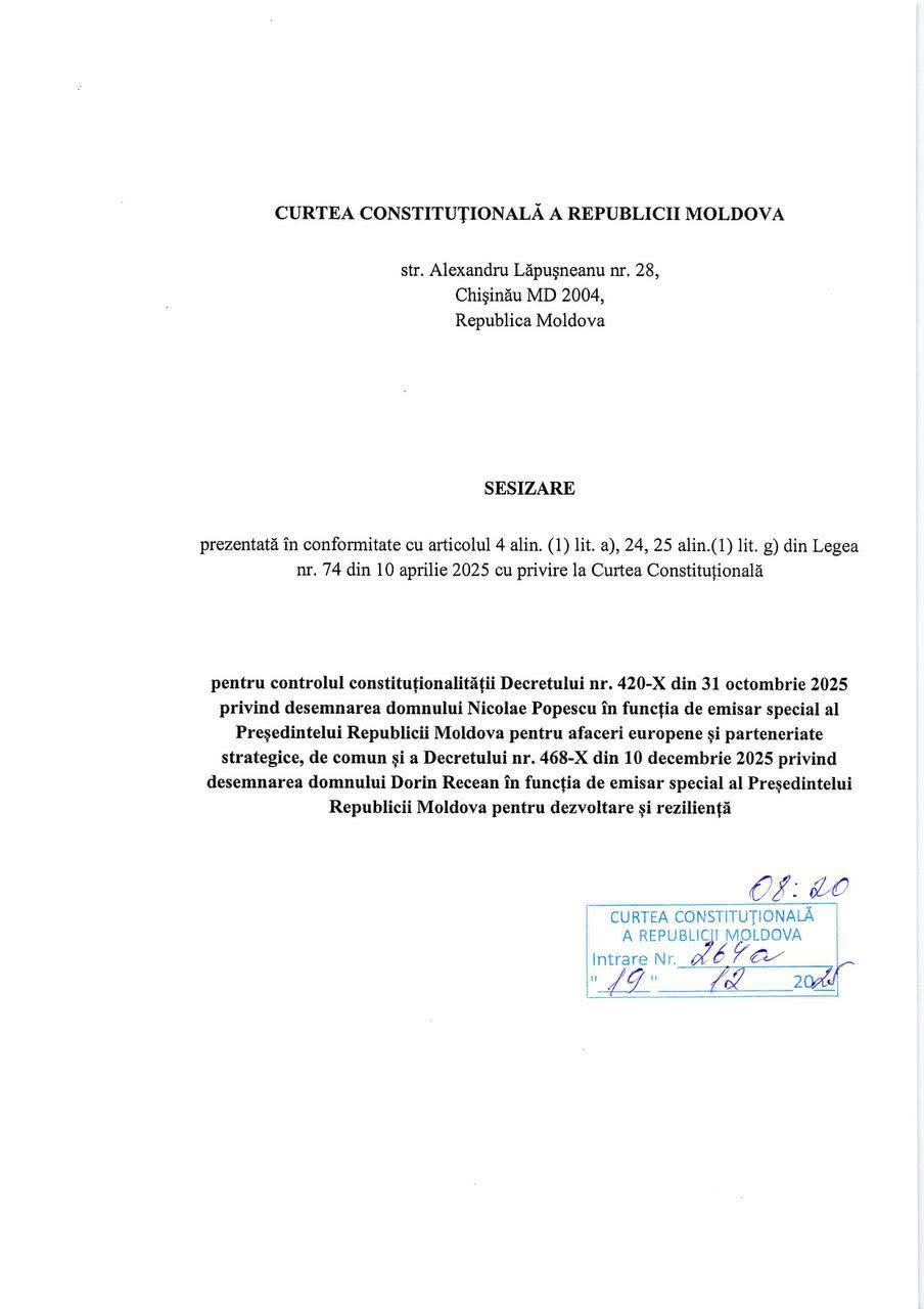 Conducătorii a patru fracțiuni parlamentare – PSRM, PCRM, „Democrația Acasă” și „Alternativa” – am depus o sesizare la Curtea Constituțională, solicitând declararea neconstituționalității decretelor prezidențiale privind numirea lui Nicolae Popescu și a lui Dorin Recean în funcția de emisari speciali, întrucât o asemenea funcție nu este prevăzută de lege.