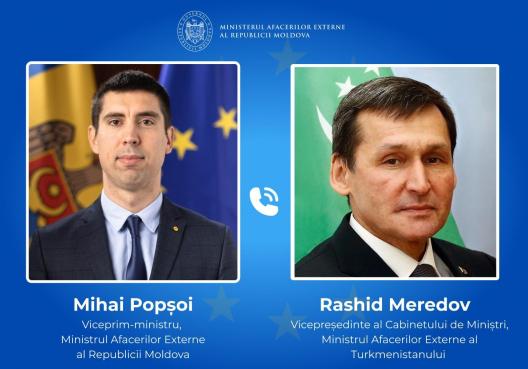 Viceprim-ministrul, ministrul afacerilor externe al Republicii Moldova, Mihai Popșoi, a avut o convorbire telefonică cu vicepreședintele Cabinetului de Miniștri, ministrul afacerilor externe al Turkmenistanului, Rashid Meredov.
