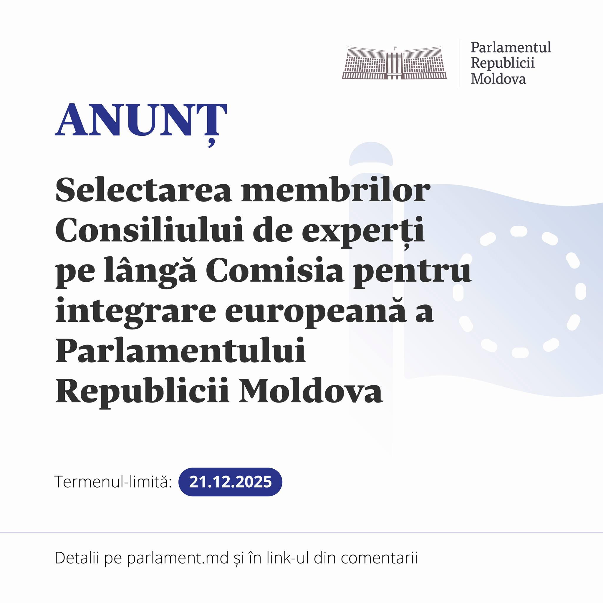 În conformitate cu punctul 8.1 din Hotărârea Parlamentului nr. 149/2023 privind aprobarea Platformei de dialog și participare civică la procesul decizional al Parlamentului, Comisia pentru integrare europeană anunță demararea procedurii de selectare a membrilor Consiliului de experți pe următoarele domenii: