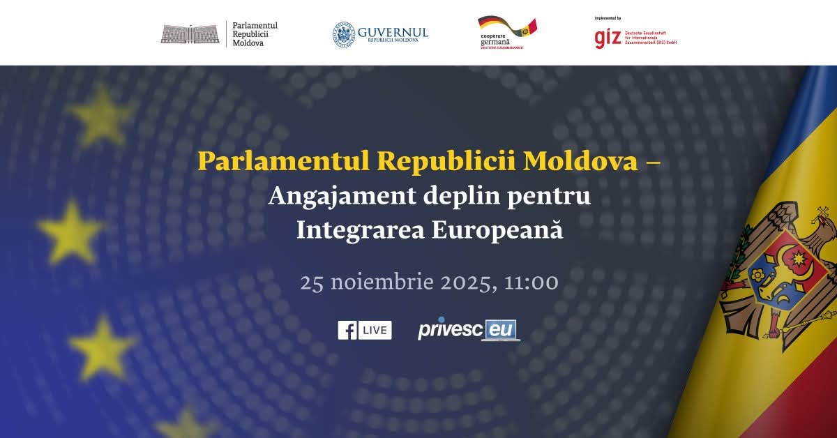 Parlamentul Republicii Moldova, prin Comisia pentru Integrare Europeană, și Biroul pentru Integrare Europeană organizează pe 25 noiembrie 2025 conferința „Parlamentul Republicii Moldova – Angajament deplin pentru Integrarea Europeană”, o platformă de dialog interinstituțional menită să consolideze rolul Legislativului în procesul de aderare la Uniunea Europeană.