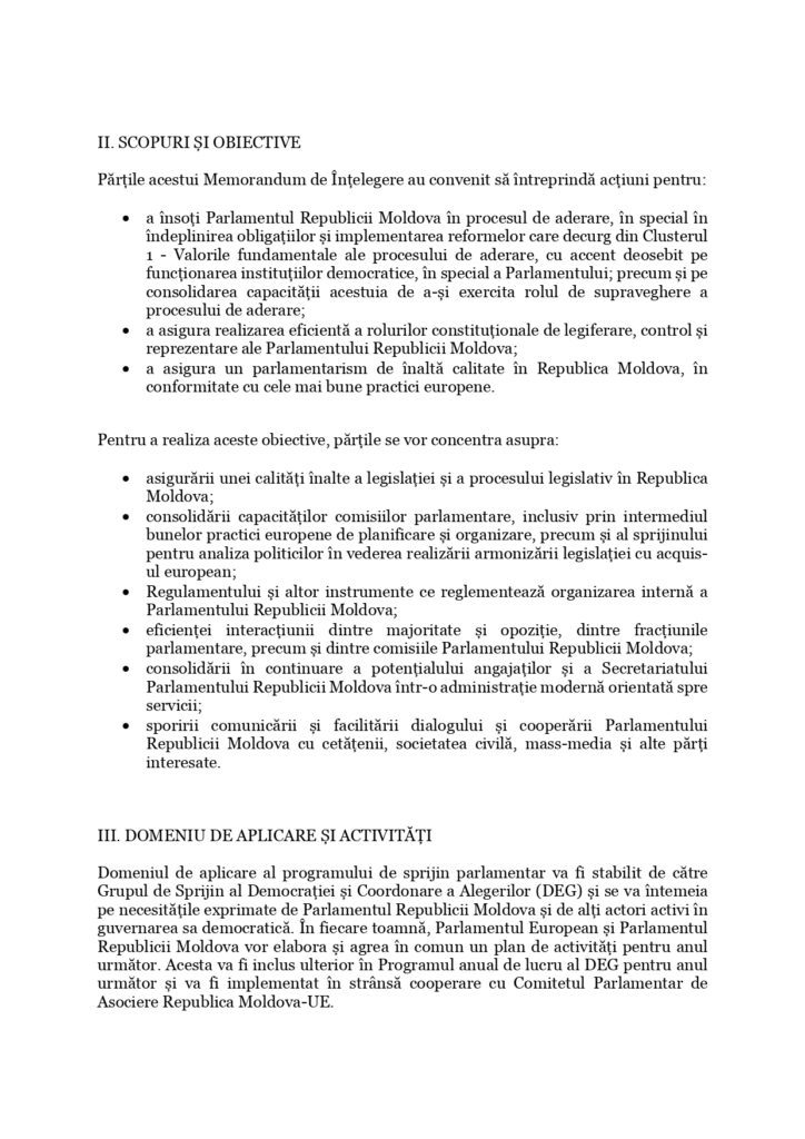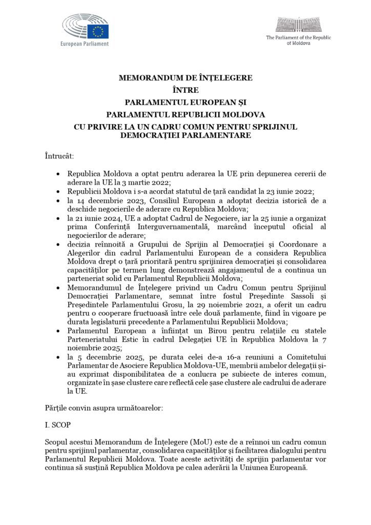 Memorandumul de Înțelegere reînnoit, care intră în vigoare de astăzi, are drept obiectiv apropierea Parlamentului Republicii Moldova de standardele Uniunii Europene. Acesta prevede consolidarea capacităților instituționale și sprijinirea eforturilor de reformă, contribuind la eficientizarea activității legislative și administrative.