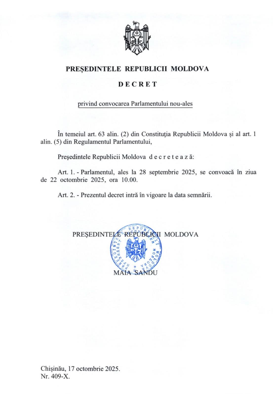 Conform Decretului prezidențial, prima ședință a noului Legislativ va avea loc miercuri, 22 octombrie curent, începând cu ora 10:00. În cadrul acesteia, deputații urmează să aleagă organele de conducere și de lucru ale Parlamentului și să inițieze procedurile pentru învestirea unui nou Guvern.