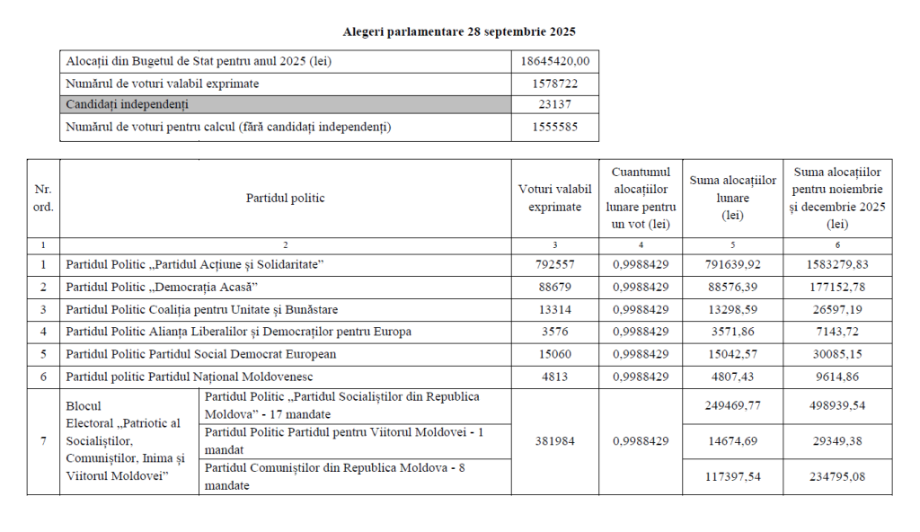 Partidul Acțiune și Solidaritate (PAS), pentru performanța în alegerile parlamentare (792 557 voturi), va primi de la bugetul de stat, în lunile noiembrie și decembrie ale anului curent, 1 583 279,83 lei (791 639,92 lei), scrie TRIBUNA.