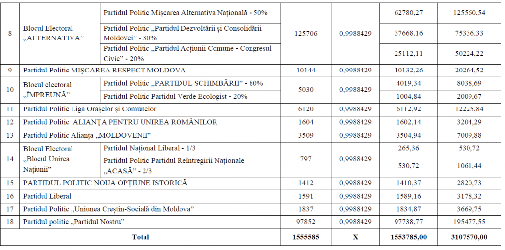 Alocațiile pe care le vor primi partidele extraparlamentare le puteți vedea în tabelul de mai jos.