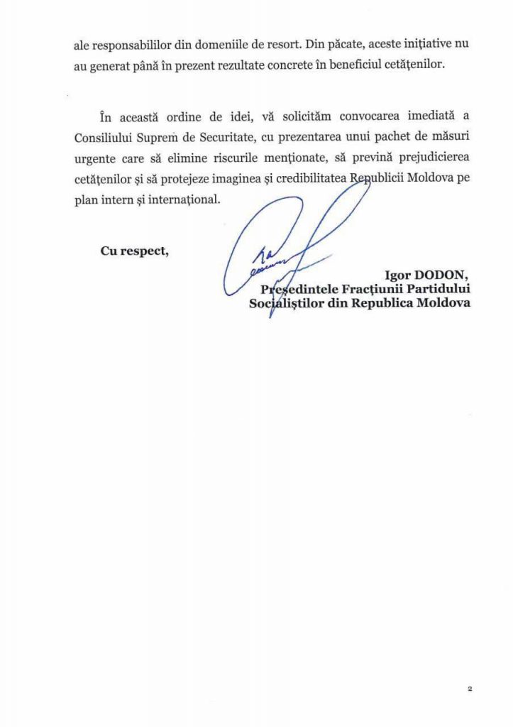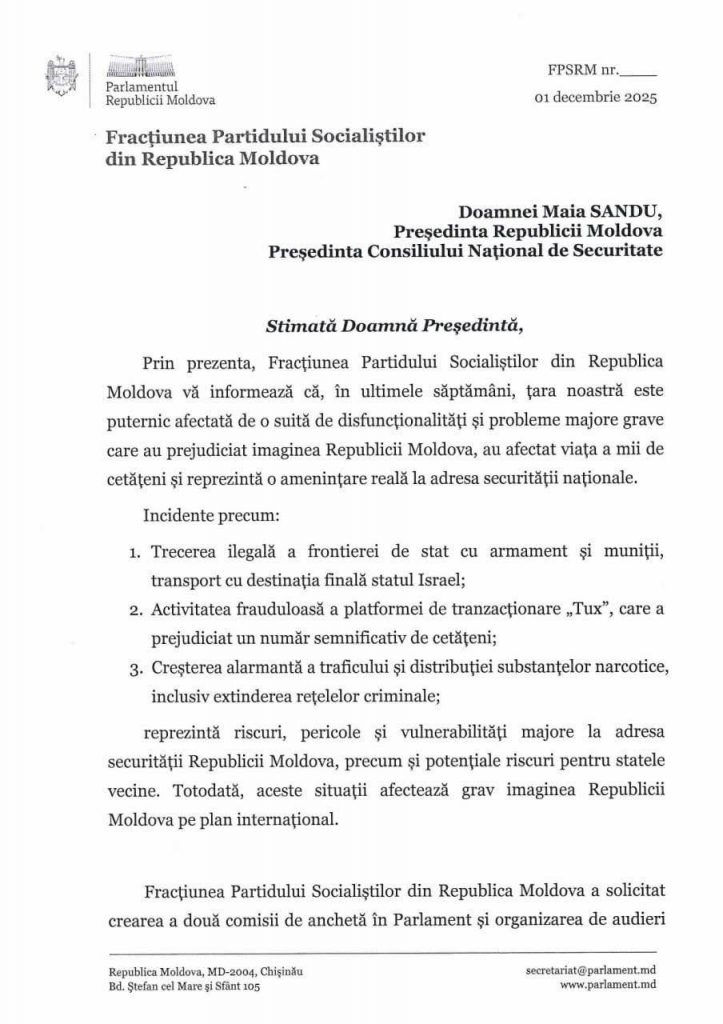 Partidul Socialiștilor din Republica Moldova (PSRM) solicită de la președinta Maia Sandu convocarea imediată a Consiliului Suprem de Securitate, din motiv că evenimentele din ultima perioadă arată că Republica Moldova se confruntă cu probleme serioase de insecuritate internă: trafic de arme și droguri, sporirea alarmantă a criminalității organizate, alte tipuri de infracțiuni și abateri care pun în pericol viața cetățenilor și au devenit cronice în ultimii ani.