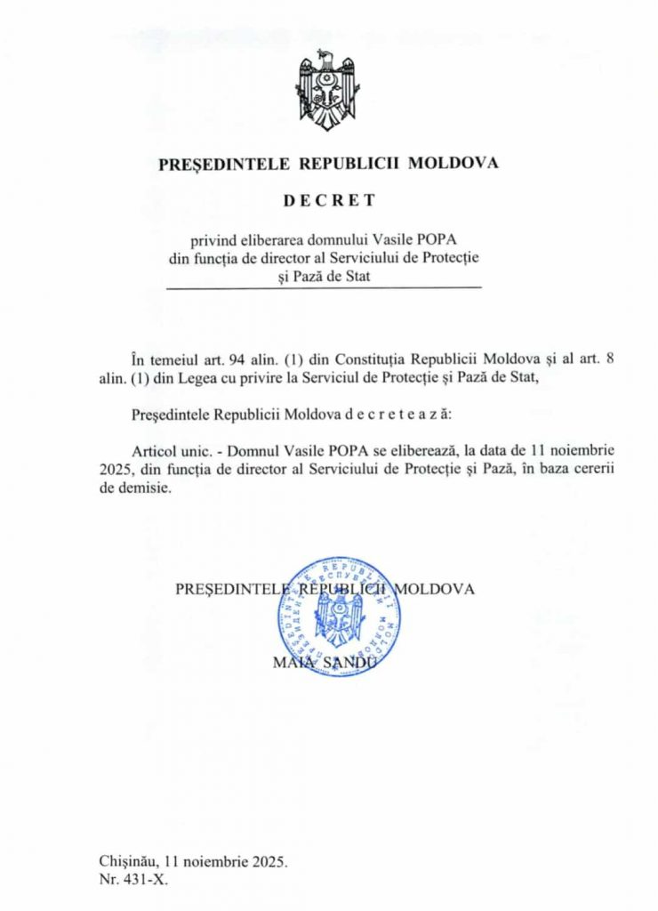 Prin decret prezidențial, Vasile Popa a fost eliberat din funcția de director al SPPS.