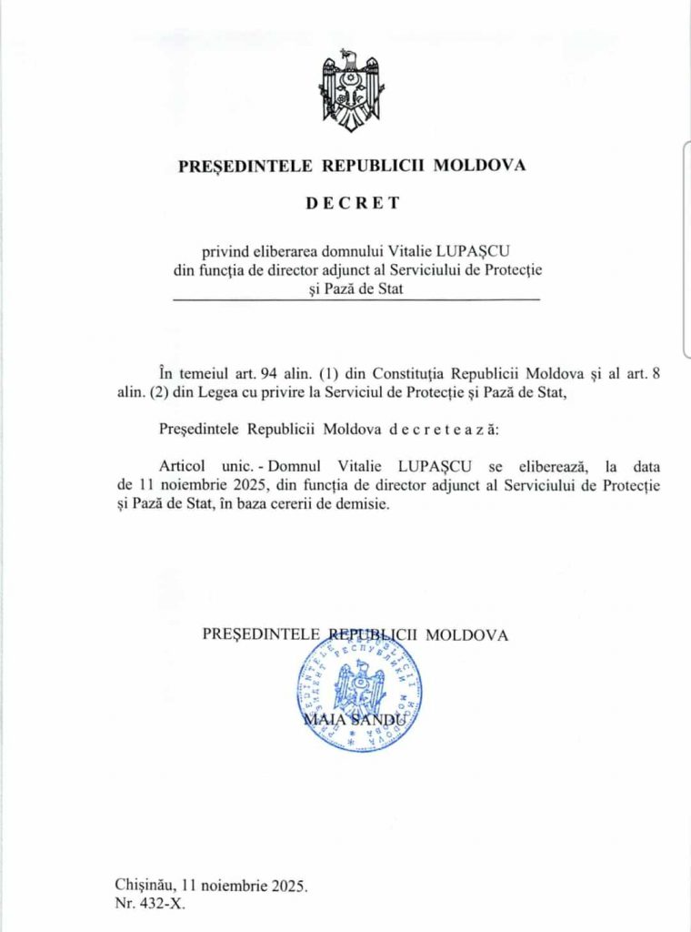 Printr-un alt decret, Vitalie Lupașcu a fost eliberat din funcția de director adjunct al SPPS.