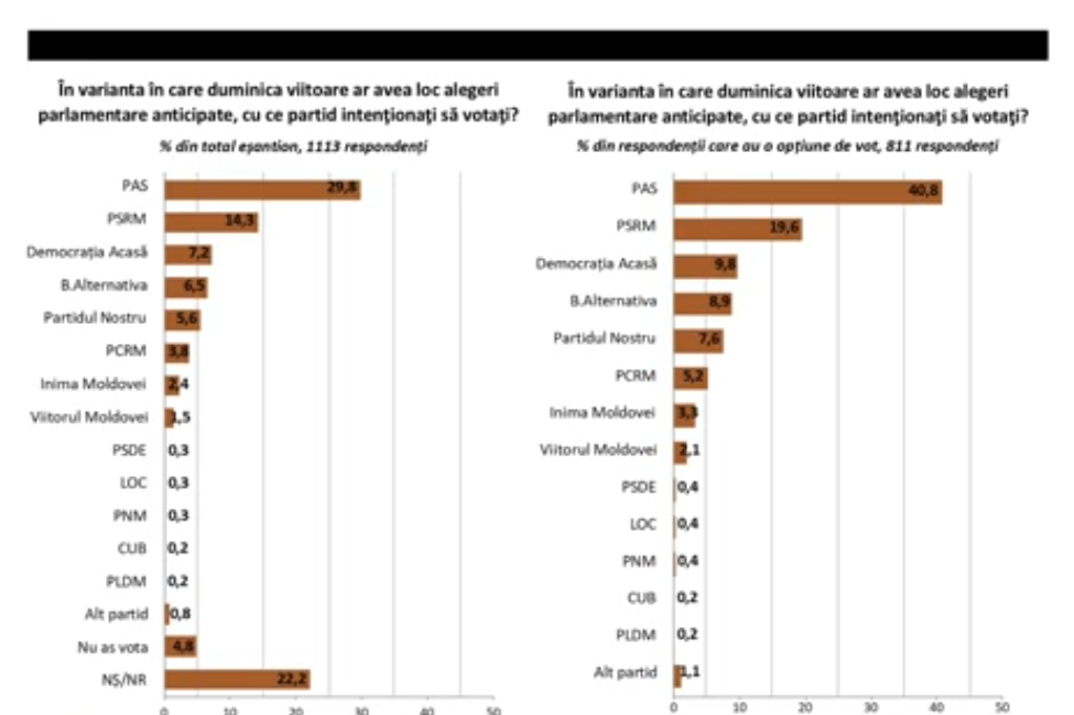 Partidul Acțiune și Solidaritate (PAS) ar obține 29,8% în cazul unor alegeri parlamentare anticipate – arată datele „Barometrului socio-politic” din februarie publicat astăzi de IMAS.