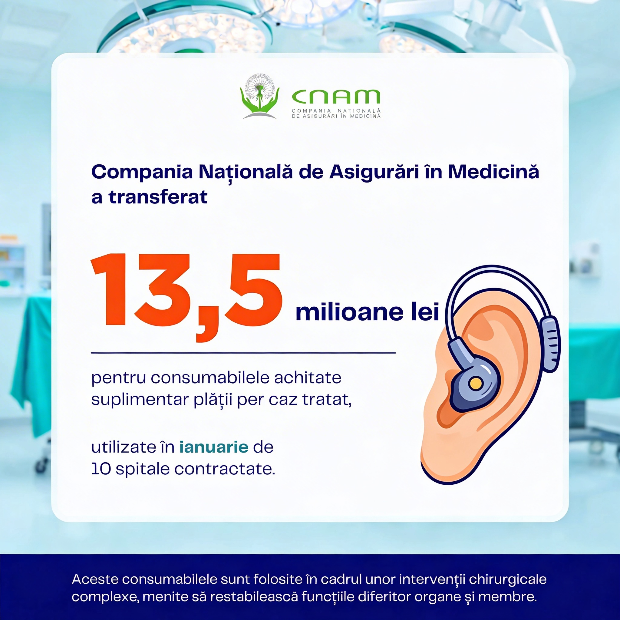 Compania Națională de Asigurări în Medicină a transferat 13,5 milioane de lei pentru consumabilele achitate suplimentar plății per caz tratat, utilizate în luna ianuarie de 10 spitale contractate. Aceste consumabilele sunt folosite în cadrul unor intervenții chirurgicale complexe pentru restabilirea funcțiilor diferitor organe și membre.