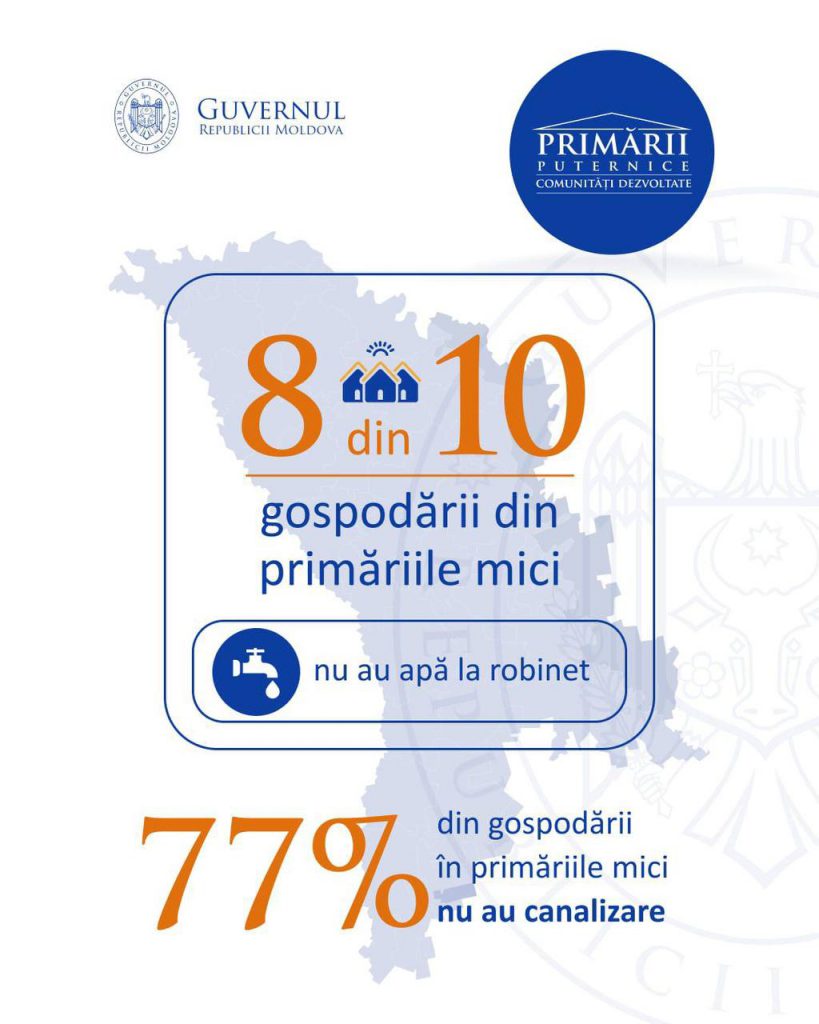 Inegalitatea în dezvoltare – primăriile mari reușesc să modernizeze mult mai rapid comunitățile comparativ cu primăriile mici. 34% din gospodăriile din Republica Moldova nu au apă și canalizare, iar dintre ele: