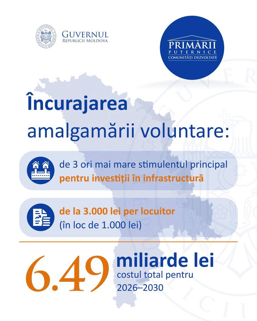 „Amalgamarea voluntară continuă. Guvernul va oferi de 3 ori mai mulți bani pentru investiții în infrastructură localităților care se vor amalgama. Costul total al pachetului de stimulente pentru 2026–2030 este de 6.491 miliarde lei.