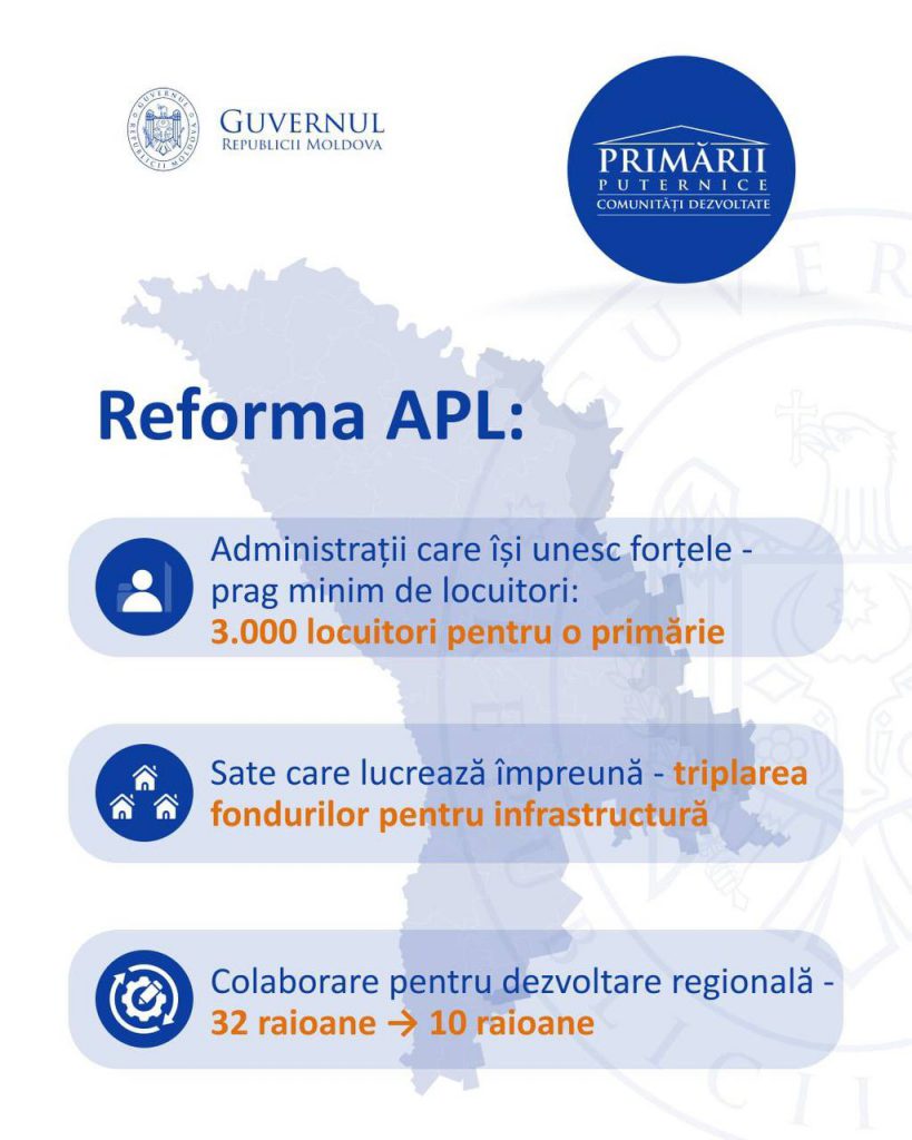 Guvernul, reprezentat de secretarul general Alexei Buzu, astăzi, în cadrul unei conferințe de presă, a prezentat conceptul de reformă a administrației publice locale „pentru a avea primării puternice și localități dezvoltate”. Urmare a reformei, numărul de primării „se va reduce drastic”, iar raioanele din 32 vor fi 10.