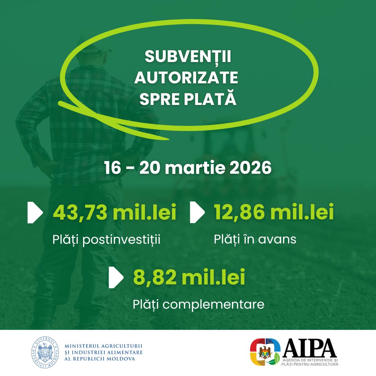 În perioada 16-20 martie 2026, Agenția de Intervenție și Plăți pentru Agricultură a autorizat spre plată subvenții în valoare de 65,41 milioane de lei din Fondul național de dezvoltare a agriculturii și mediului rural.