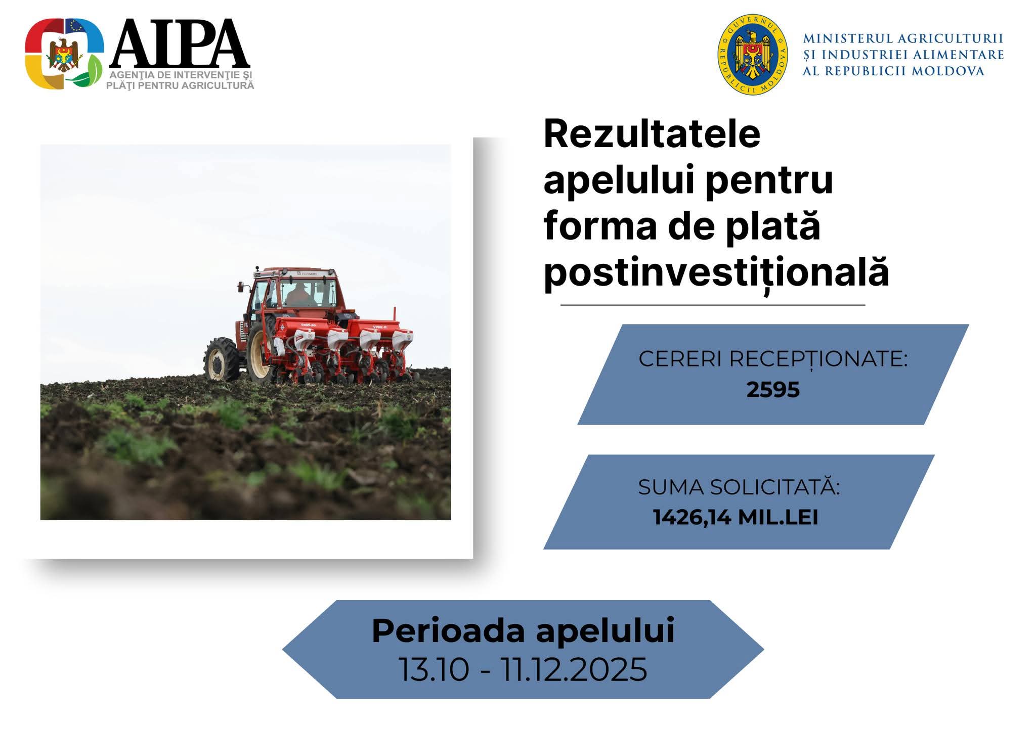 Agenția de Intervenție și Plăți pentru Agricultură anunță rezultatele despre cererile solicitate urmare a apelului desfășurat în perioada 13 octombrie – 11 decembrie 2025, conform Ordinului MAIA nr. 149 din 26.08.2025 cu privire la lansarea apelului III de depunere a cererilor pentru forma de subvenționare plăți post investiție.