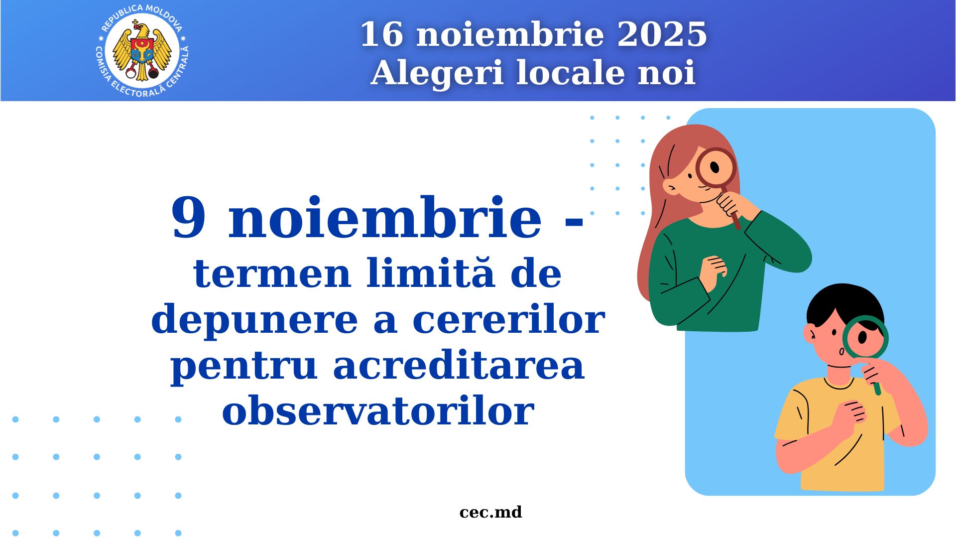 Comisia Electorală Centrală (CEC) informează că pe 9 noiembrie 2025 se încheie perioada de depunere a cererilor pentru solicitarea acreditării observatorilor pentru monitorizarea alegerilor locale noi din 16 noiembrie 2025.