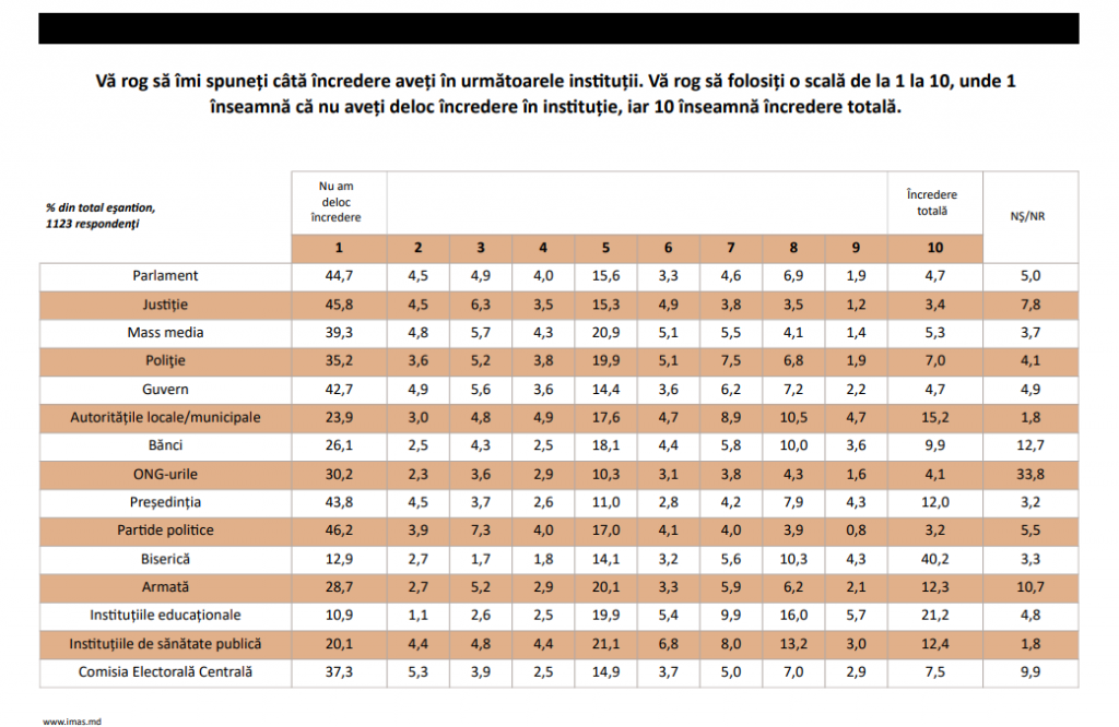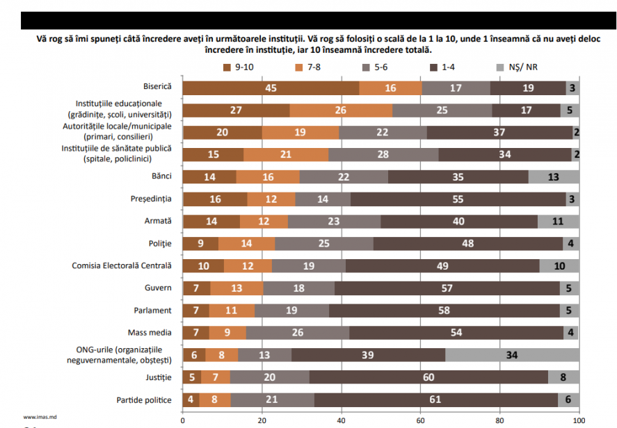 În topul încrederii, conform rezultatelor, Președinția se află pe locul 6 (16%), Guvernul – pe locul 10, iar Parlamentul – pe locul 11, cu câte 7%.