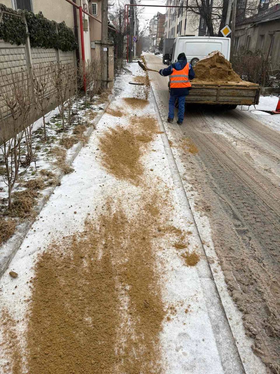 Muncitorii intervin atât mecanizat, cât și manual, pentru a împrăștia material antiderapant (sare și nisip) pe drumuri, trotuare, scări, subterane și în stațiile de așteptare a transportului public.