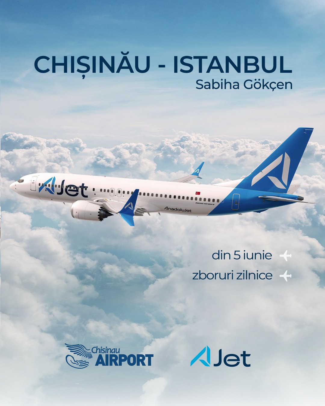 Din 5 iunie, AJet va opera zboruri zilnice între Istanbul – Sabiha Gökçen International Airport și Chișinău.
