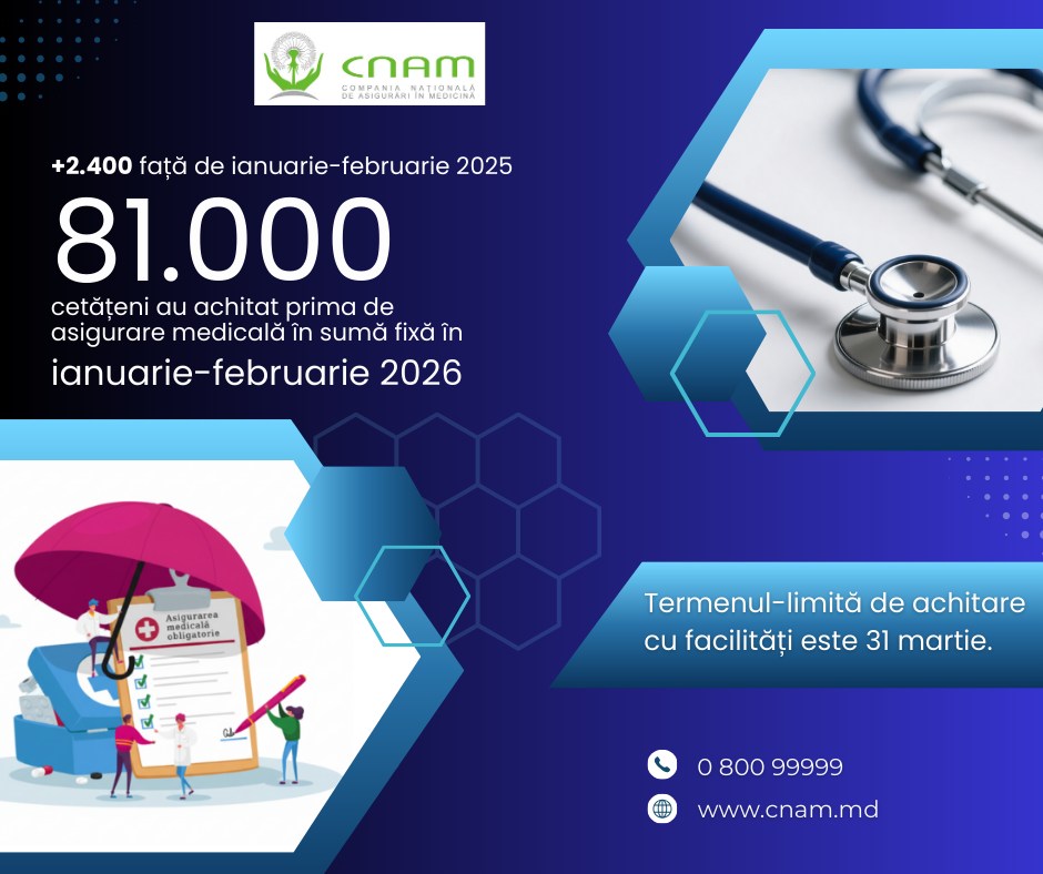 Compania Națională de Asigurări în Medicină îndeamnă cetățenii care au obligația de a achita prima în sumă fixă să-și asigure din timp protecția financiară în caz de boală. Termenul-limită de achitare a primei cu facilități este 31 martie. După această dată, persoanele care nu se vor asigura vor achita prima în mărime integrală – 12.636 de lei, precum și penalitate pentru fiecare zi de întârziere.
