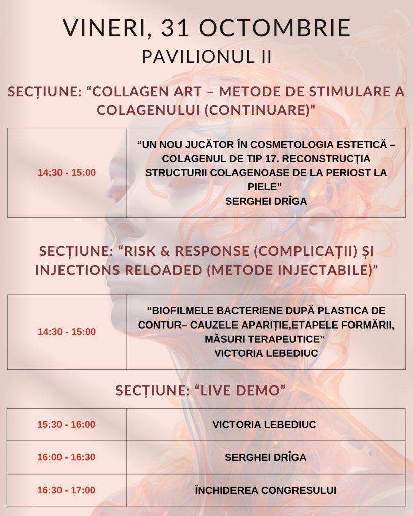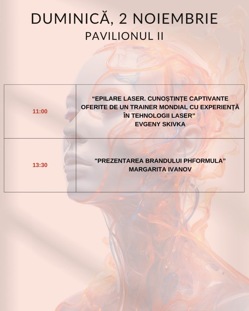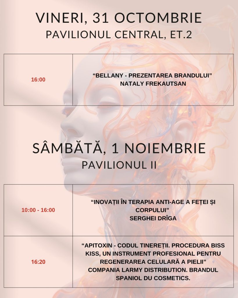 În premieră, în cadrul expoziției are loc Congresul Internațional de Cosmetologie, cu speakeri renumiți. Mai jos găsiți agenda exactă a celor 3 zile de expoziție.