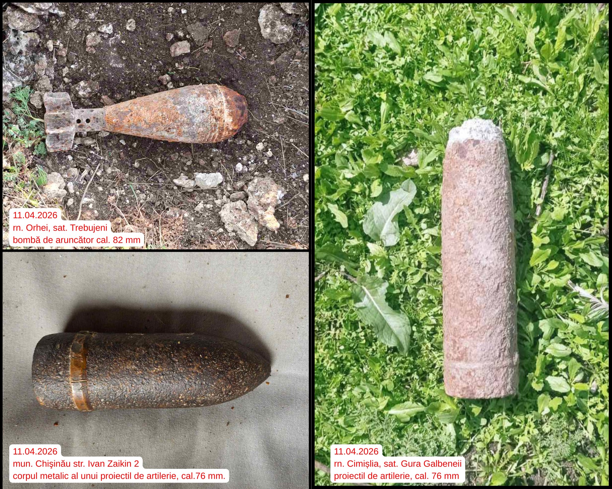 În aceeași zi, aceeași echipă a intervenit în municipiul Chișinău, pe strada Ivan Zaikin 2, unde a fost identificat corpul metalic al unui proiectil de artilerie, calibrul 76 mm.