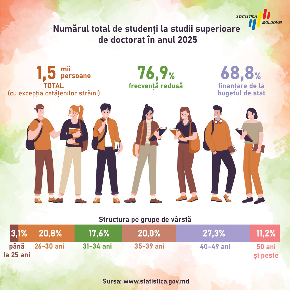 Numărul total de studenți la studii superioare de doctorat în anul 2025, a constituit 1,5 mii de persoane (cu excepția cetățenilor străini), în creștere cu 4,8% față de anul precedent. Din numărul total de studenți la studii superioare de doctorat, 76,9% erau înscriși la studii cu frecvență redusă, față de 77,0% în anul 2024. Ponderea femeilor în numărul total de studenți la studii superioare de doctorat rămâne superioară celei a bărbaților (60,1% față de 39,9%), în ușoară creștere față de anul 2024, când ponderea femeilor a fost de 59,5%.