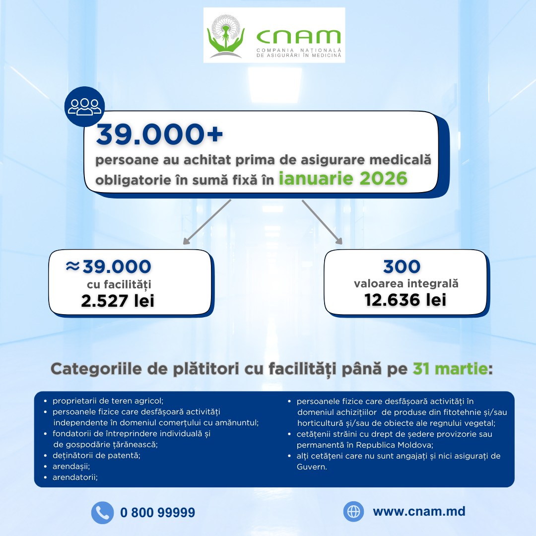 Compania Națională de Asigurări în Medicină amintește că de facilități la achitarea primei în sumă fixă beneficiază mai multe categorii de persoane: proprietarii de teren cu destinație agricolă, persoanele fizice care desfășoară activități independente în domeniul comerțului cu amănuntul, cu excepția comerțului cu mărfuri supuse accizelor, fondatorii de întreprindere individuală și de gospodărie țărănească, deținătorii de patentă, arendașii, arendatorii, persoanele fizice care desfășoară activități în domeniul achizițiilor de produse din fitotehnie și/sau horticultură și/sau de obiecte ale regnului vegetal, cetățenii străini cu drept de ședere provizorie sau permanentă în Republica Moldova, alți cetățeni care nu sunt angajați și nici asigurați de Guvern.