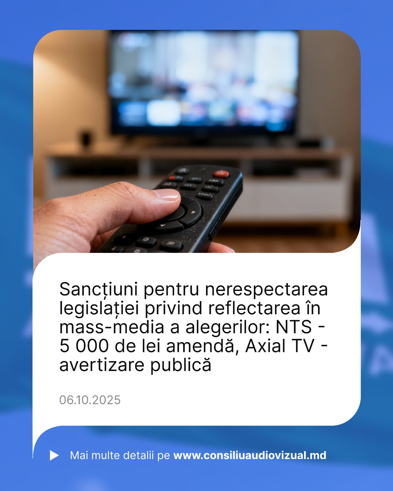În ultima ședință a Consiliului Audiovizualului (CA), membrii autorității de reglementare au dispus o amendă de 5 000 de lei postului de televiziune „NTS” și o avertizare publică pentru „Axial TV”, în rezultatul încălcării de către serviciile media audiovizuale menționate a prevederii stabilite la art. 90 alin. (1) din Codul electoral: „În perioada electorală, programele audiovizuale cu caracter electoral și materialele scrise care vizează, într-un fel sau altul, grupurile de inițiativă, concurenții electorali (candidații în alegeri) și participanții la referendum sunt difuzate/publicate cu respectarea Regulamentului privind reflectarea alegerilor de către instituțiile mass-media, aprobat de Comisia Electorală Centrală.”