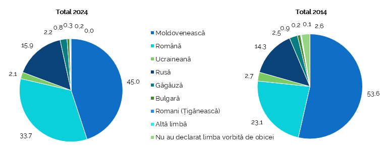 Comparativ cu recensământul 2014, la recensământul 2024 a crescut ponderea celor care au declarat ca limbă vorbită româna, de la 23,1% la 33,7%, adică cu 10,6 p.p., respectiv a scăzut ponderea celor care au declarat moldovenească ca limbă vorbită de obicei, de la 53,6% la 45,0%, sau cu 8,6 p.p. Ușoară creștere au înregistrat și limbile rusă, de la 14,3% în 2014 la 15,9% în 2024 și romani (țigănească), de la 0,2% la 0,3%, în timp ce limbile ucraineană, găgăuză și bulgară au scăzut ca pondere (Figura 10).