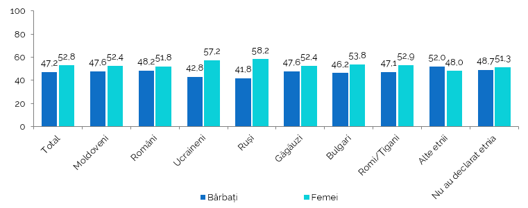 Structura etnică în funcție de structura pe sexe a populației prezintă preponderența femeilor la toate etniile, cu cea mai mare pondere la populația de etnie rusă (58,2%) și ucraineană (57,2%). Excepție constituie categoria însumată de alte etnii, unde ponderea bărbaților este mai mare (52,0%) decât cea a femeilor (48,0%) (Figura 3, Tabelul 5.3 din Anexă).