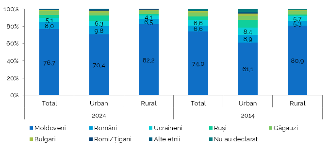 Ponderea ucrainenilor a scăzut de la 6,6% la 5,1%, a rușilor de la 4,1% la 3,4%, găgăuzilor de la 4,3% la 4,0% și a bulgarilor de la 1,8% la 1,6%. Alte etnii per total au înregistrat o creștere de la 0,5% în 2014 la 0,6% în 2024 (Figura 1).