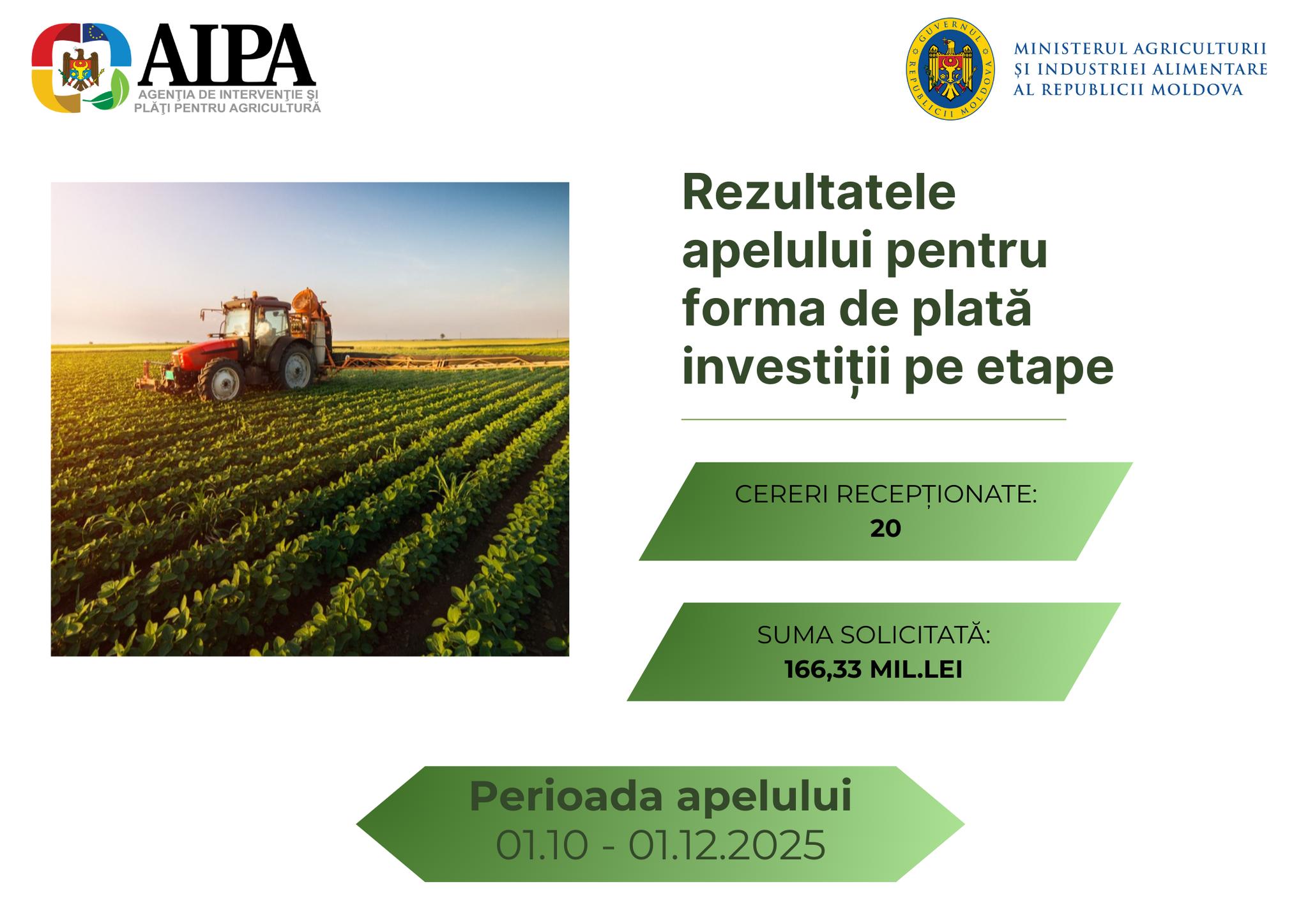 Agenția de Intervenție și Plăți pentru Agricultură informează că data de 1 decembrie 2025 a fost ultima zi de recepționare a cererilor de acordare a subvențiilor pentru plată în avans și pentru investiții pe etape.