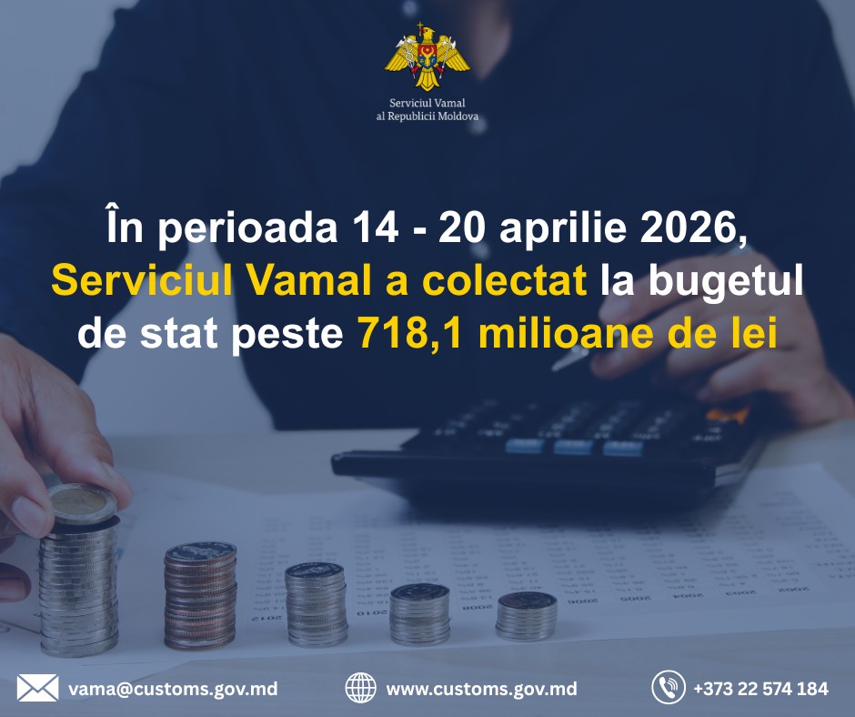 În perioada 14 – 20 aprilie 2026, încasările Serviciului Vamal la bugetul de stat se ridică la peste 718,1 milioane de lei, ceea ce constituie îndeplinirea cifrei de control pentru perioada de referință în mărime de 102,6%. De la începutul anului curent, Serviciul Vamal a colectat la bugetul de stat circa 11,8 miliarde de lei, ceea ce constituie îndeplinirea cifrei de control la 102,8%.