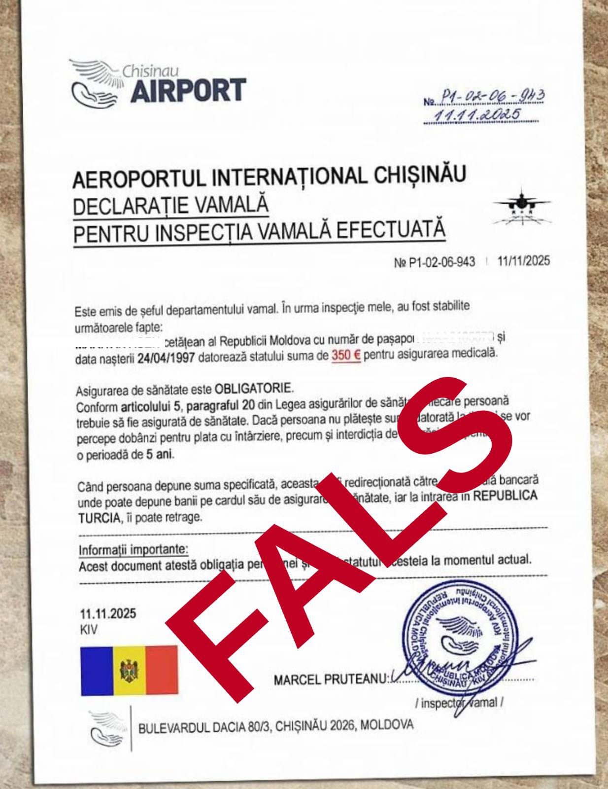 Așa-numita „Declarație vamală pentru inspecția vamală efectuată”, cu pretinse taxe de 350 € pentru asigurare medicală, este un fals.