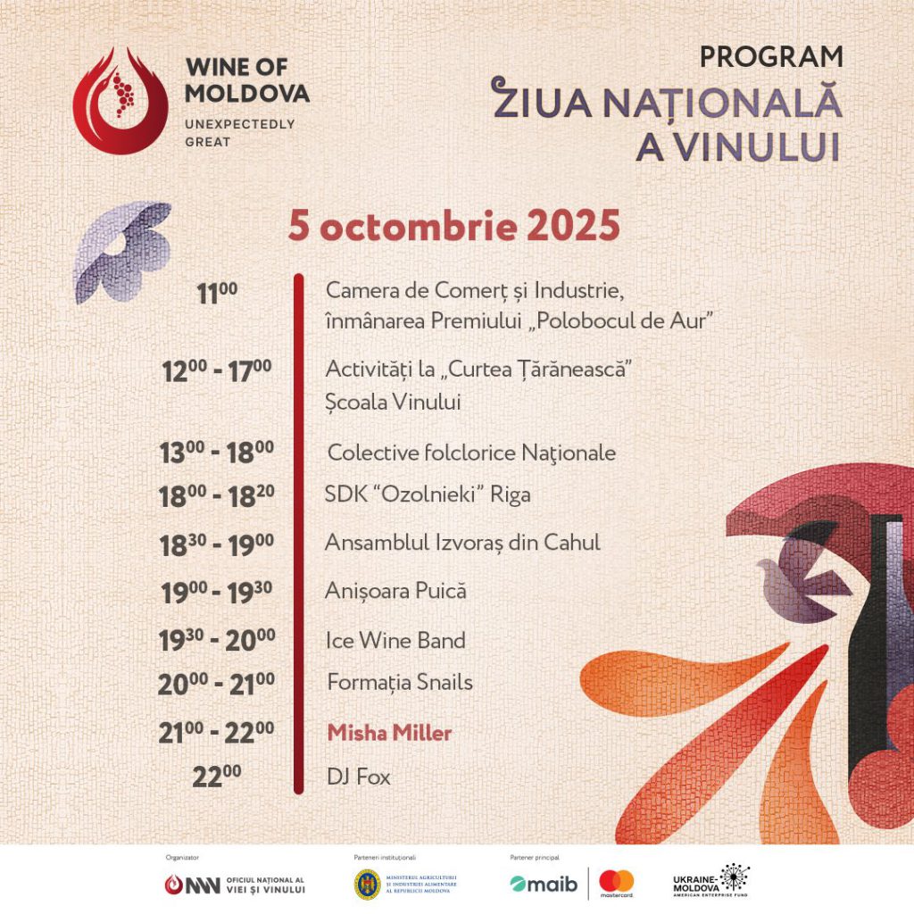 Pe 4 și 5 octombrie, în Piața Marii Adunări Naționale are loc ediția a XXIV-a a Zilei Naționale a Vinului, la care participă 106 vinării din toate regiunile țării. Evenimentul reunește producători consacrați și mici vinificatori, fiecare venind cu propriile istorii despre muncă, tradiție și inovație.