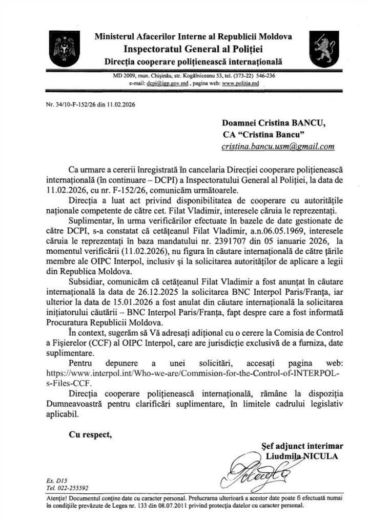Ex-premierul Vlad Filat, lider al Partidului Liberal Democrat din Moldova, a anunțat că, la data de 15 ianuarie 2026, Interpol a anulat darea în căutare internațională emisă anterior pe numele său. Decizia a fost luată la solicitarea instituției care a cerut aplicarea notificării respective.
